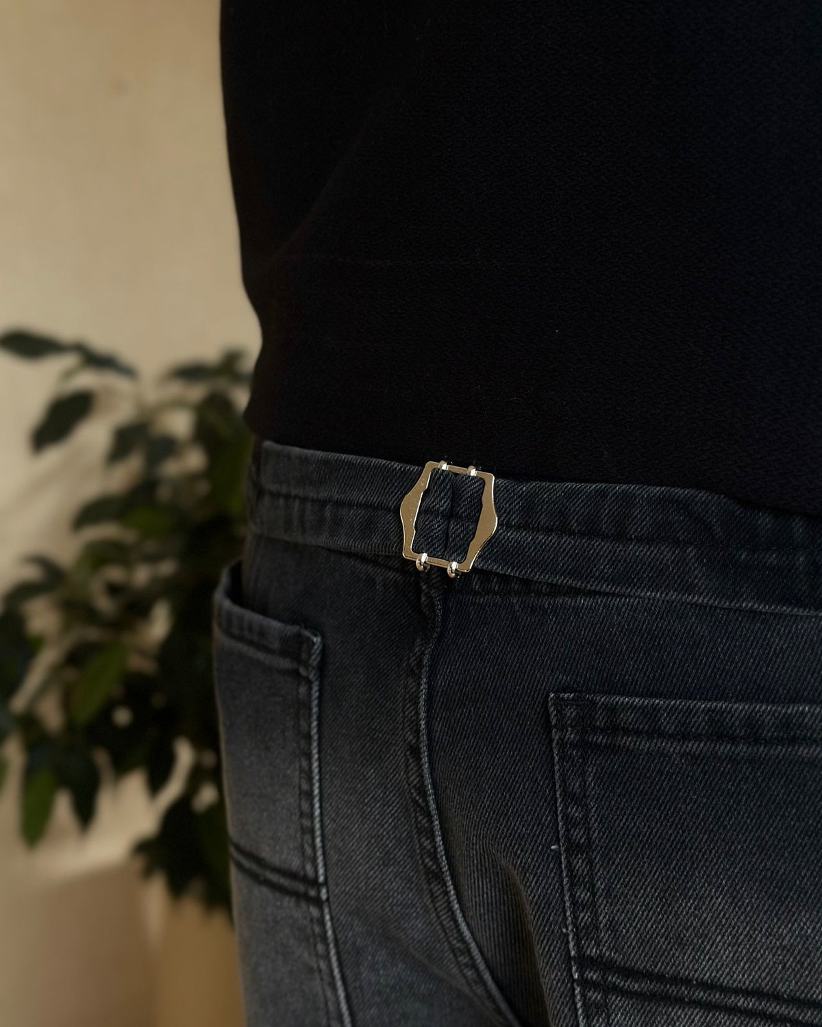 Jean rígido gris con evilla ajustable. Liso corte baggy.