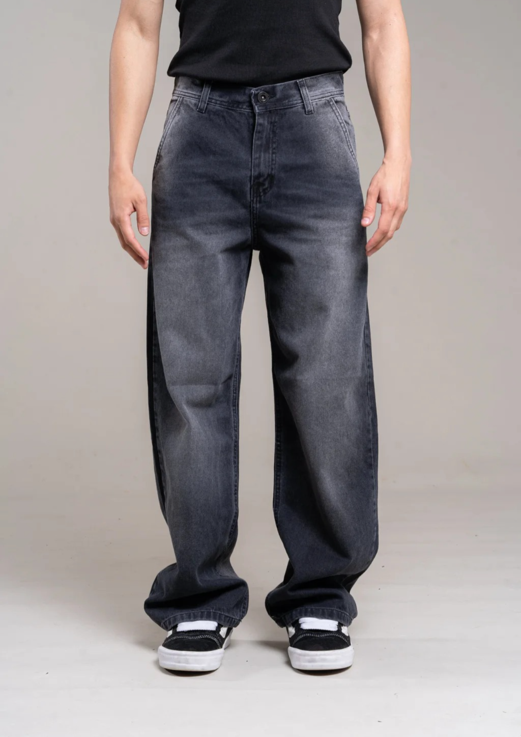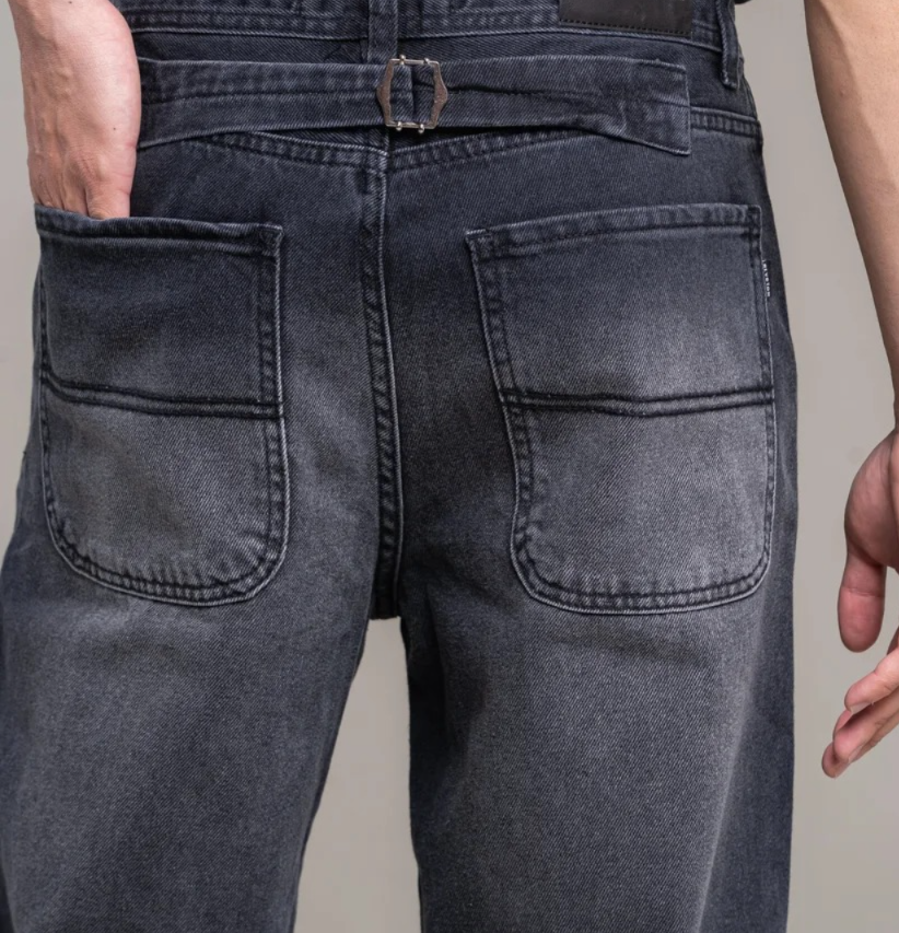 Jean rígido gris con evilla ajustable. Liso corte baggy.