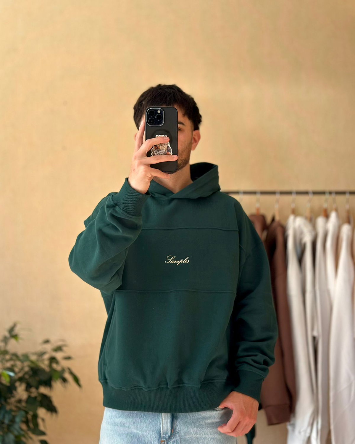 Buzo oversize unisex de frisa premium con puños y cintura en ribb. Costuras horizontales y bordado en pecho.