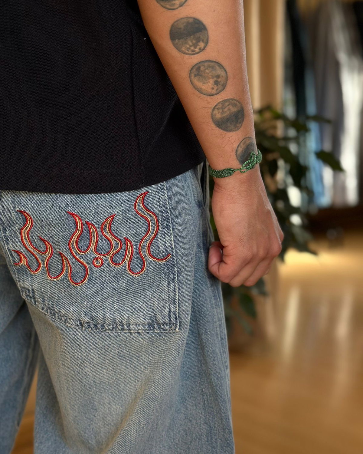 Jean rígido con bordado en bolsillo trasero, corte baggy.