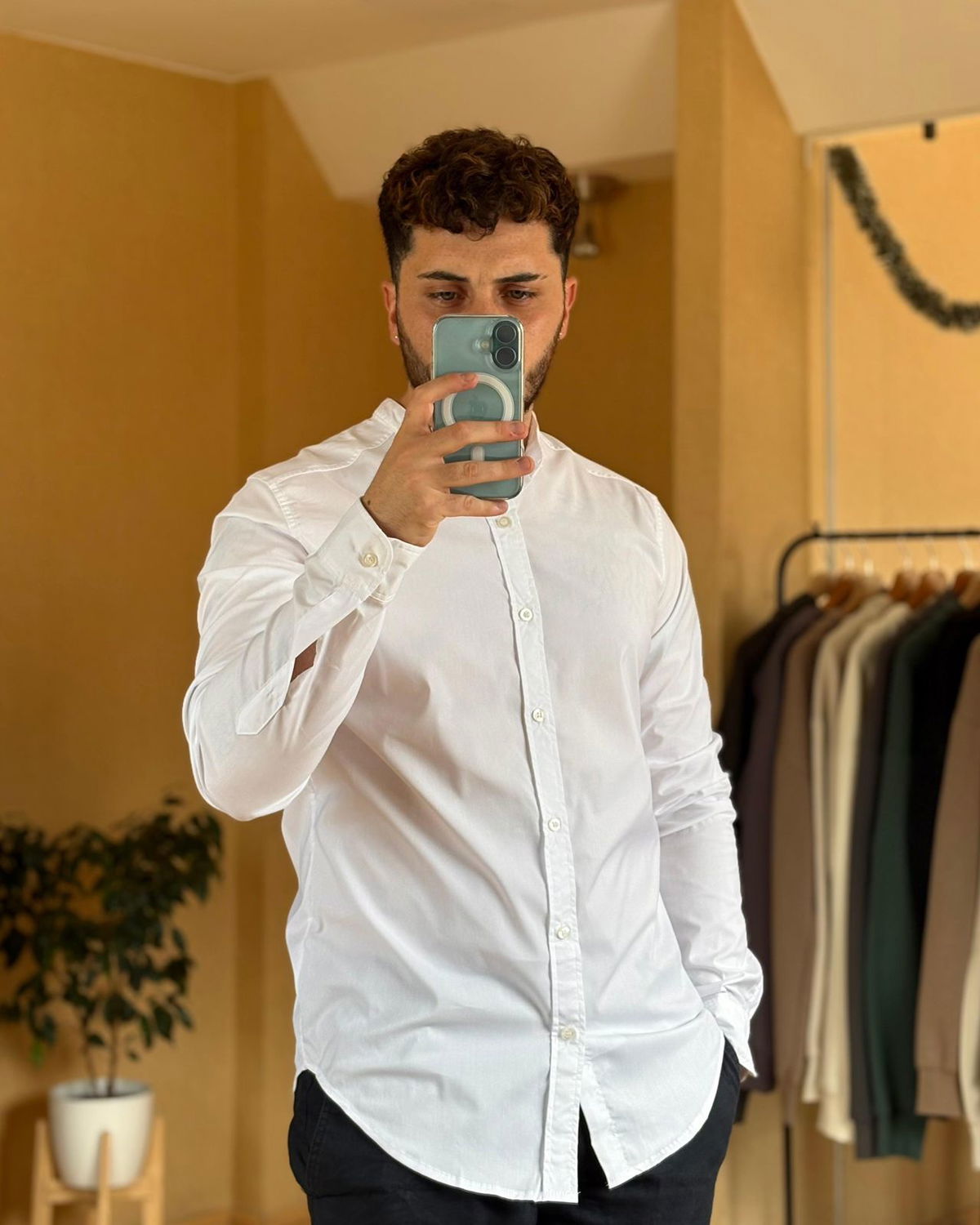 Camisa lisa cuello mao, entallada de poplín elastizada.