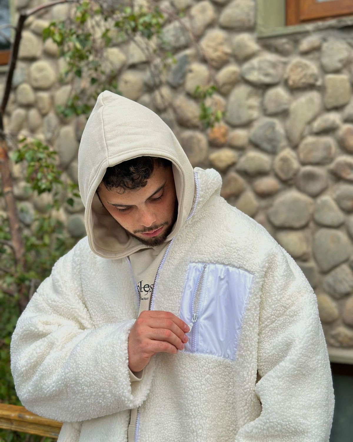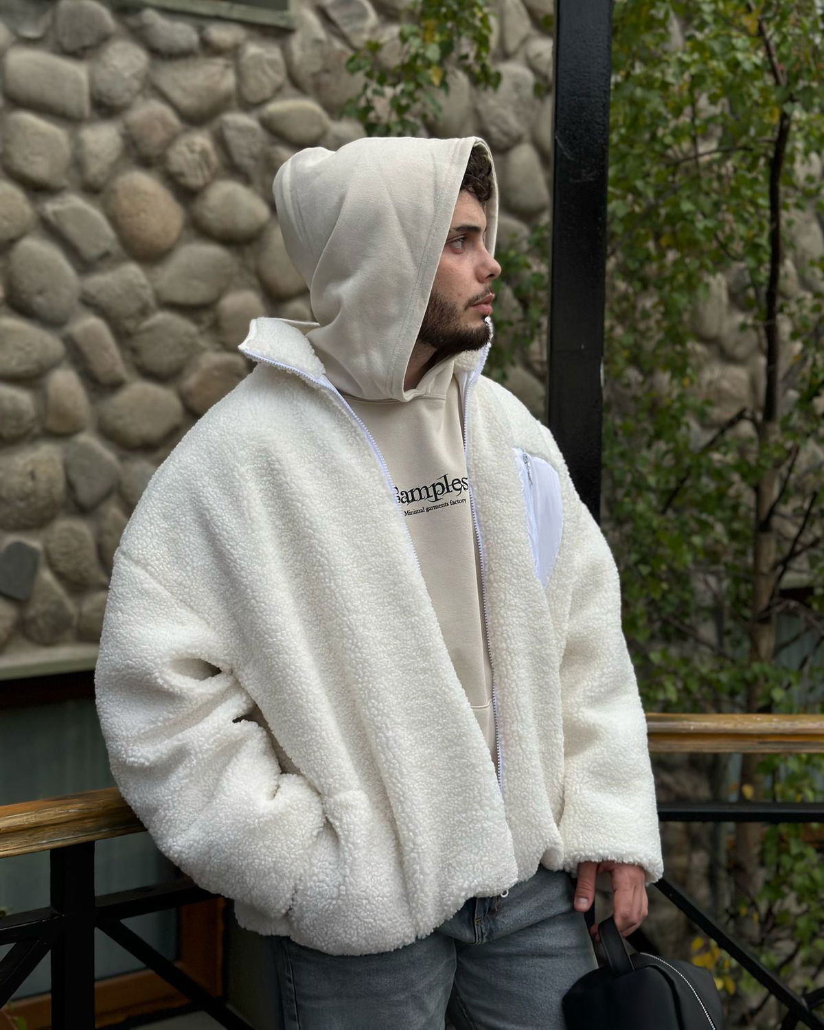 Campera de corderito forrada en sire opaco a tono, con envivado en cuello, mangas y cintura.