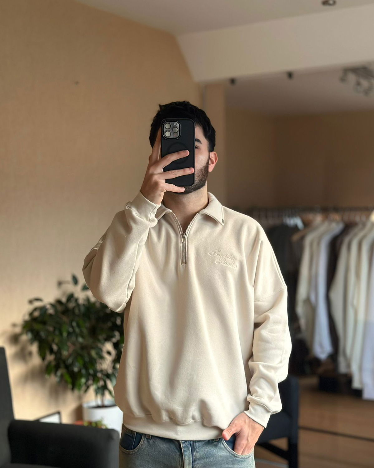 Buzo boxy oversize de frisa, cuello solapado. Bordado al tono en parte superior izquierda.