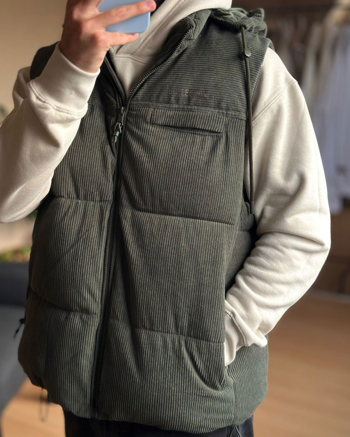 Chaleco importado de corderoy con piel por dentro. Capucha desmontable, bolsillos con cierre por dentro y fuera.