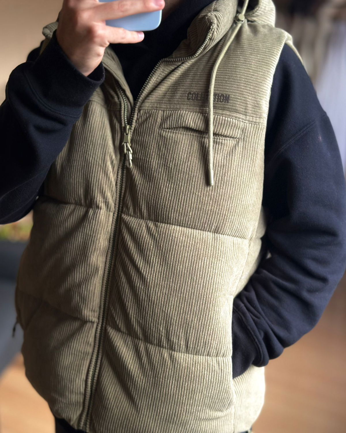 Chaleco importado de corderoy con piel por dentro. Capucha desmontable, bolsillos con cierre por dentro y fuera.