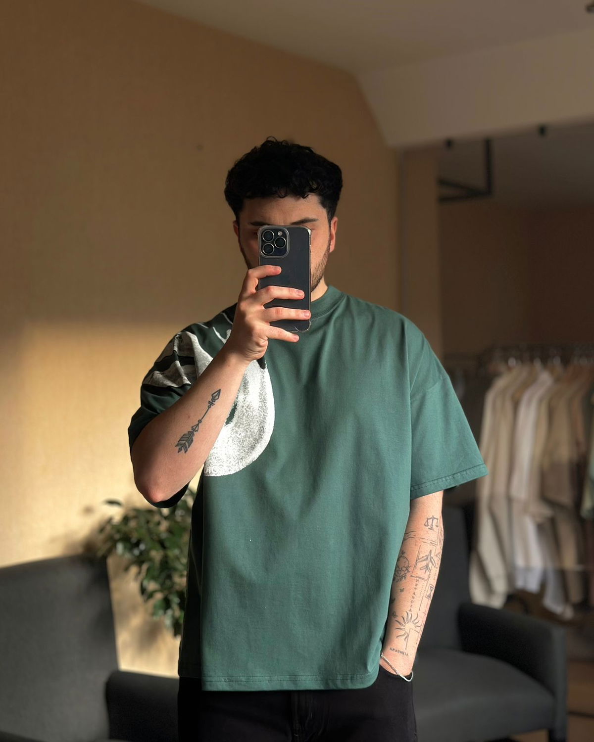 Remera de algodón peinado con cuello en ribb y costuras dobles reforzadas. Estampado en frente y espalda en serigrafia de alta densidad. Corte boxy.