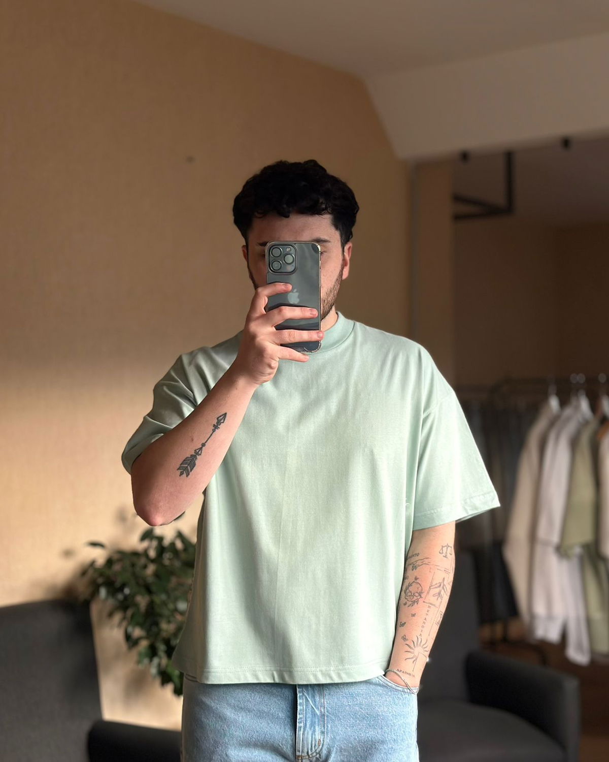 Remera de algodón peinado con cuello en ribb y costuras dobles reforzadas. Estampado en frente y espalda en serigrafia de alta densidad. Corte boxy.