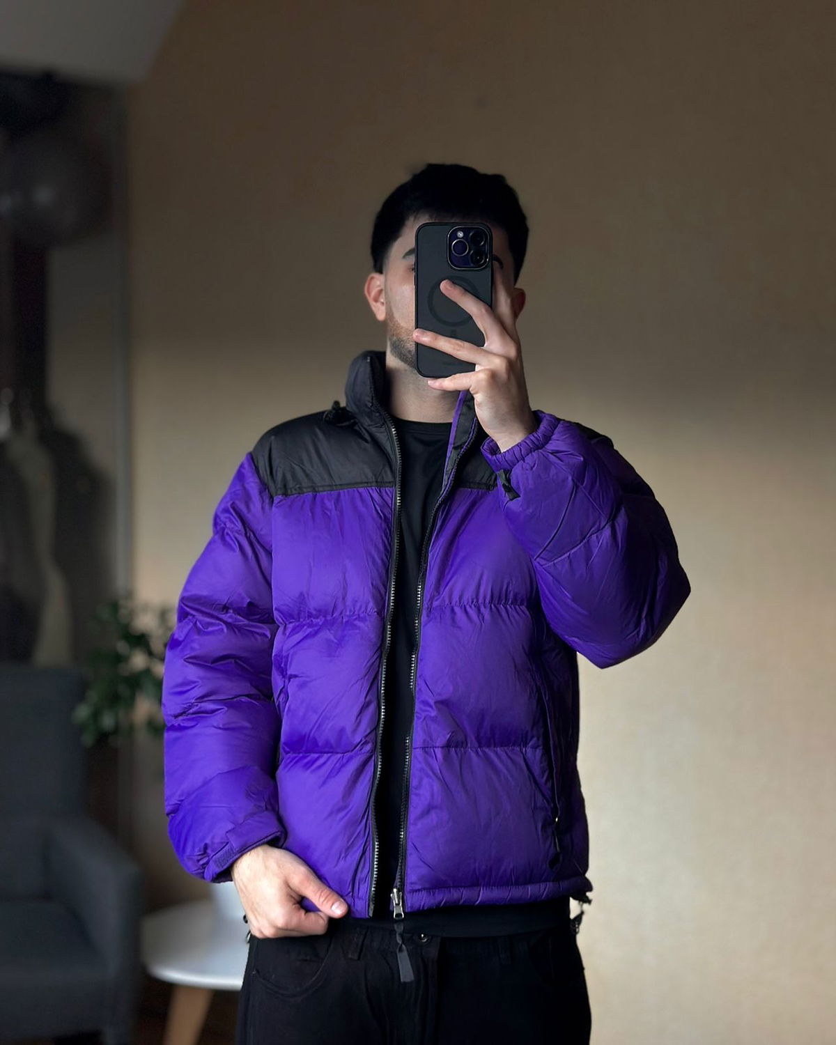 Campera puffer bicolor con relleno sintético, cierre frontal completo y bolsillos laterales con cierre. Capucha dentro del cuello.