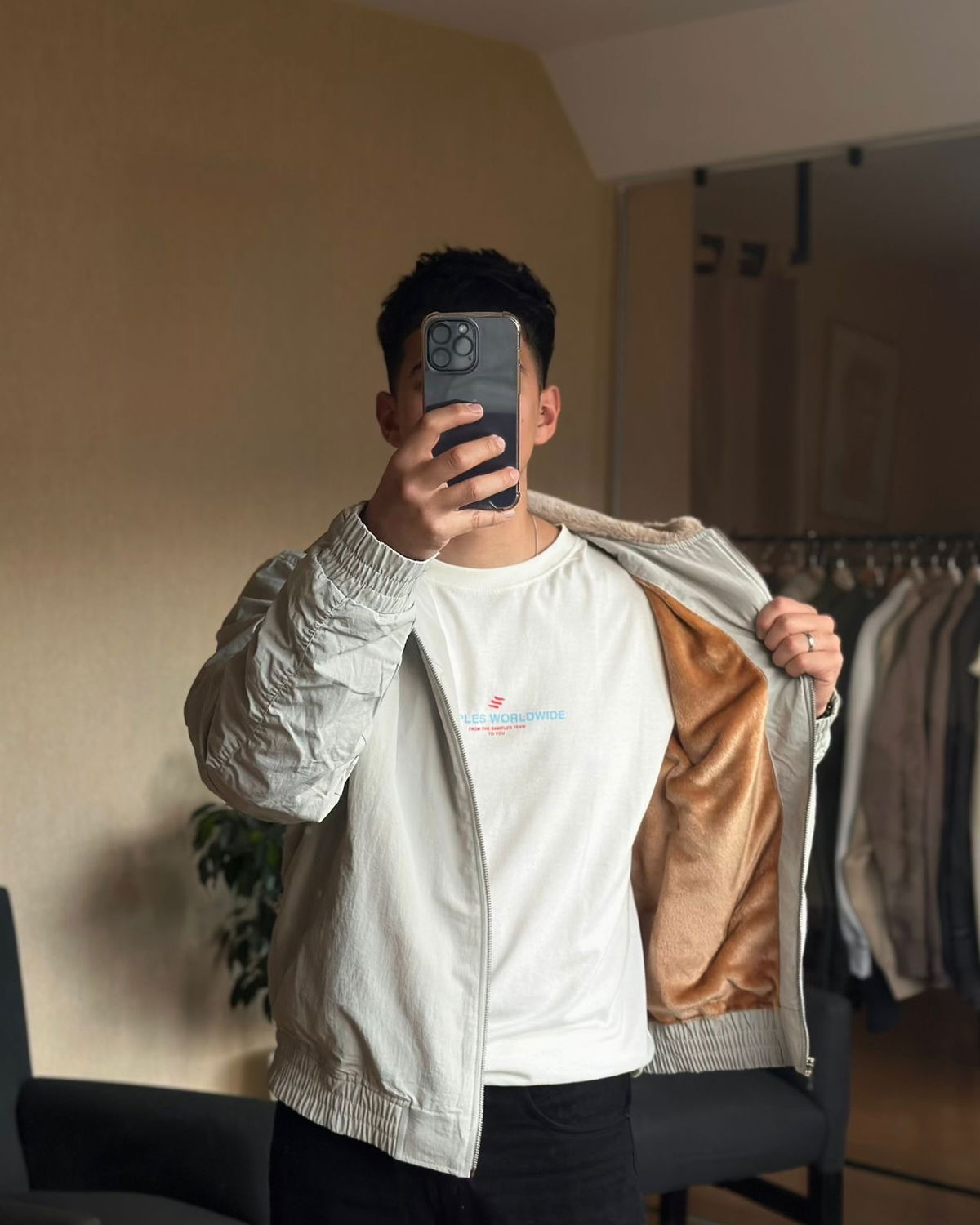 Campera bomber parachute forrada en piel de corderito con capucha de piel. Bolsillos delanteros, cintura y puños con elástico. Corte oversize.