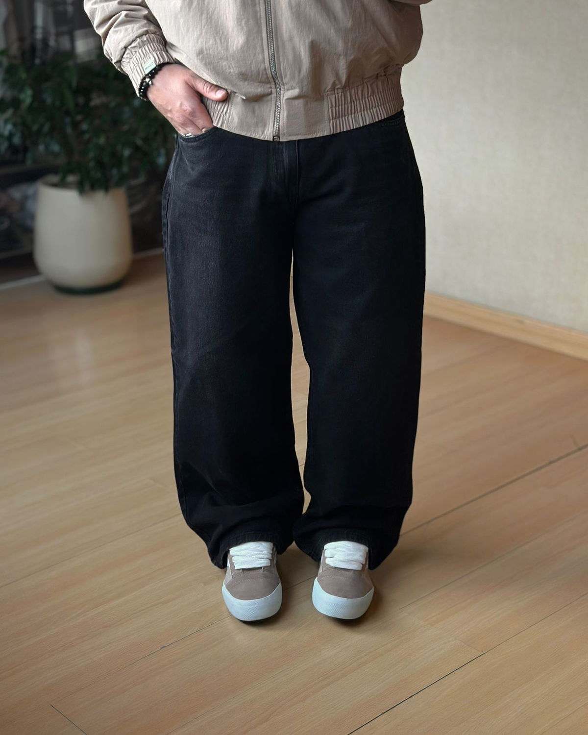 Jean negro rígido. Liso corte baggy.