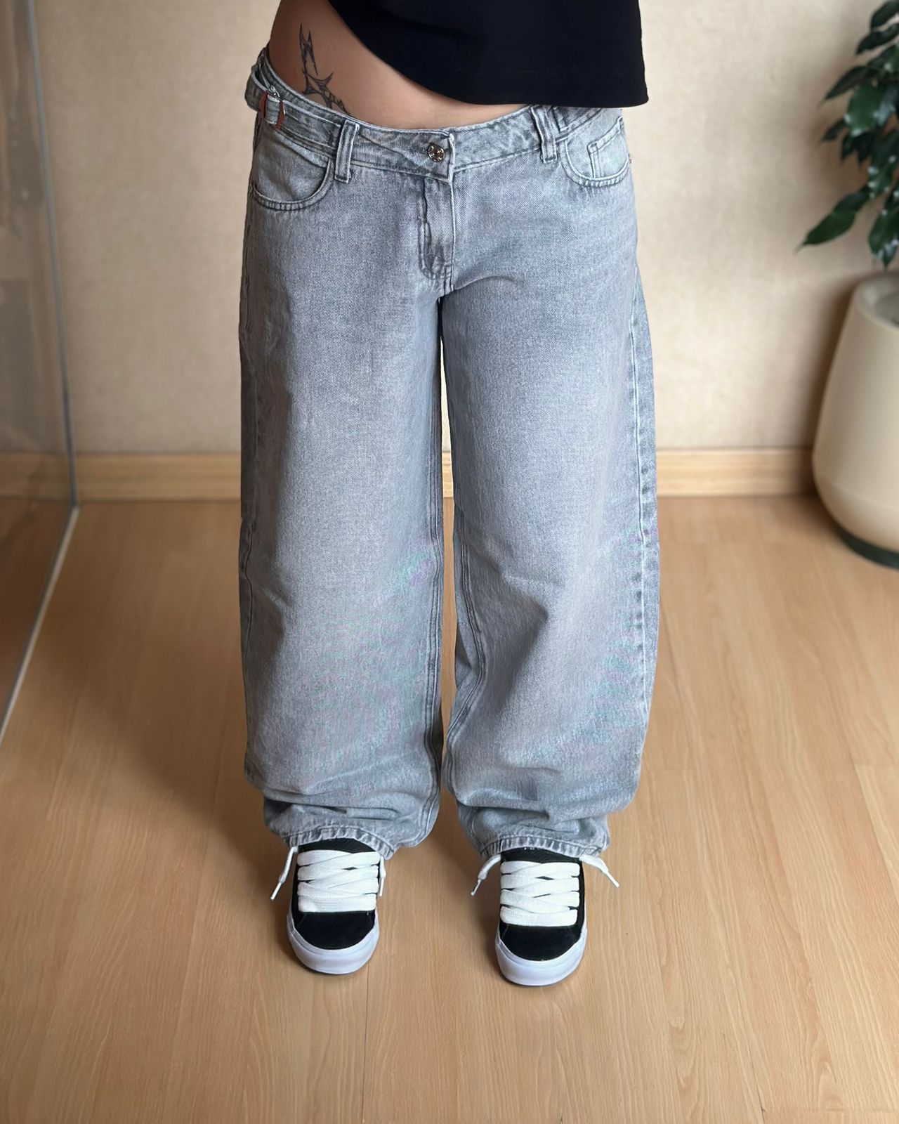 Jean rígido tiro bajo con hebilla lateral regulable. Liso corte baggy.