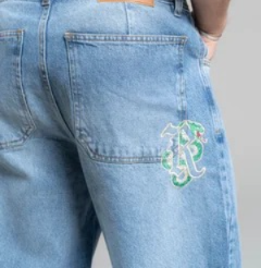Jean rígido bordado en bolsillo trasero, corte baggy.