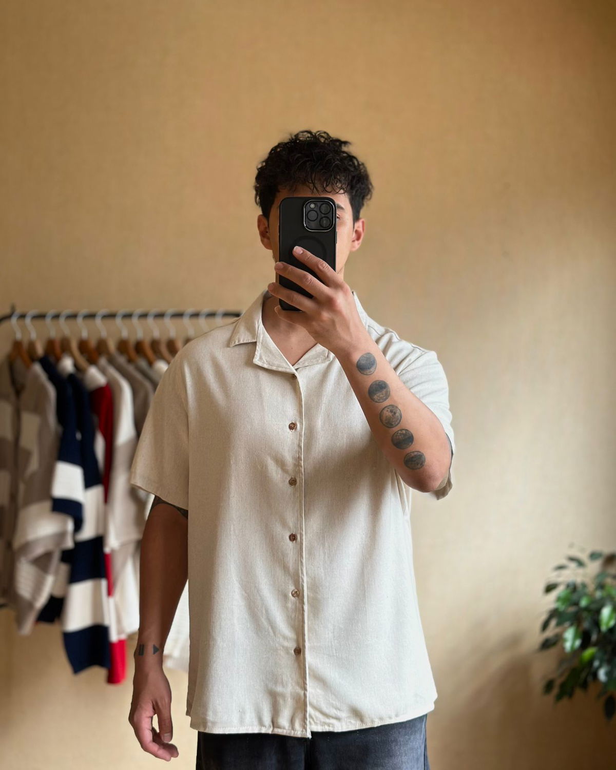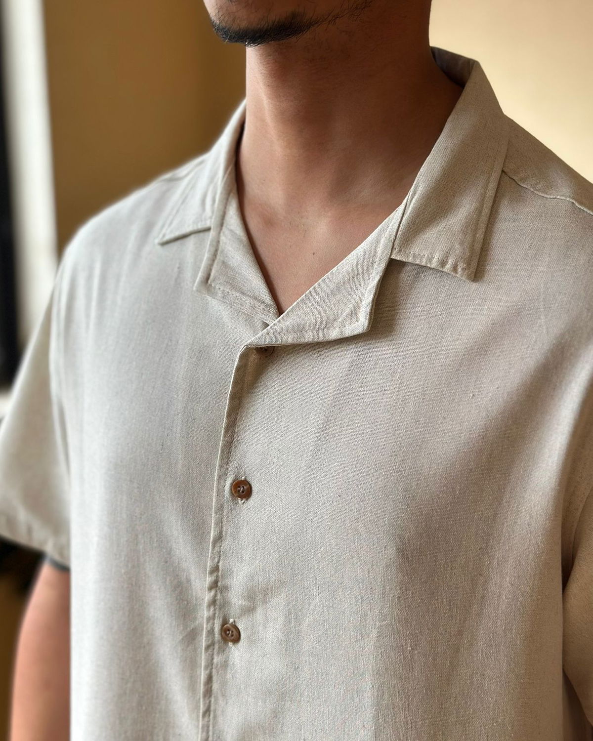 Camisa de lino texturado cuello clásico, corte oversize.