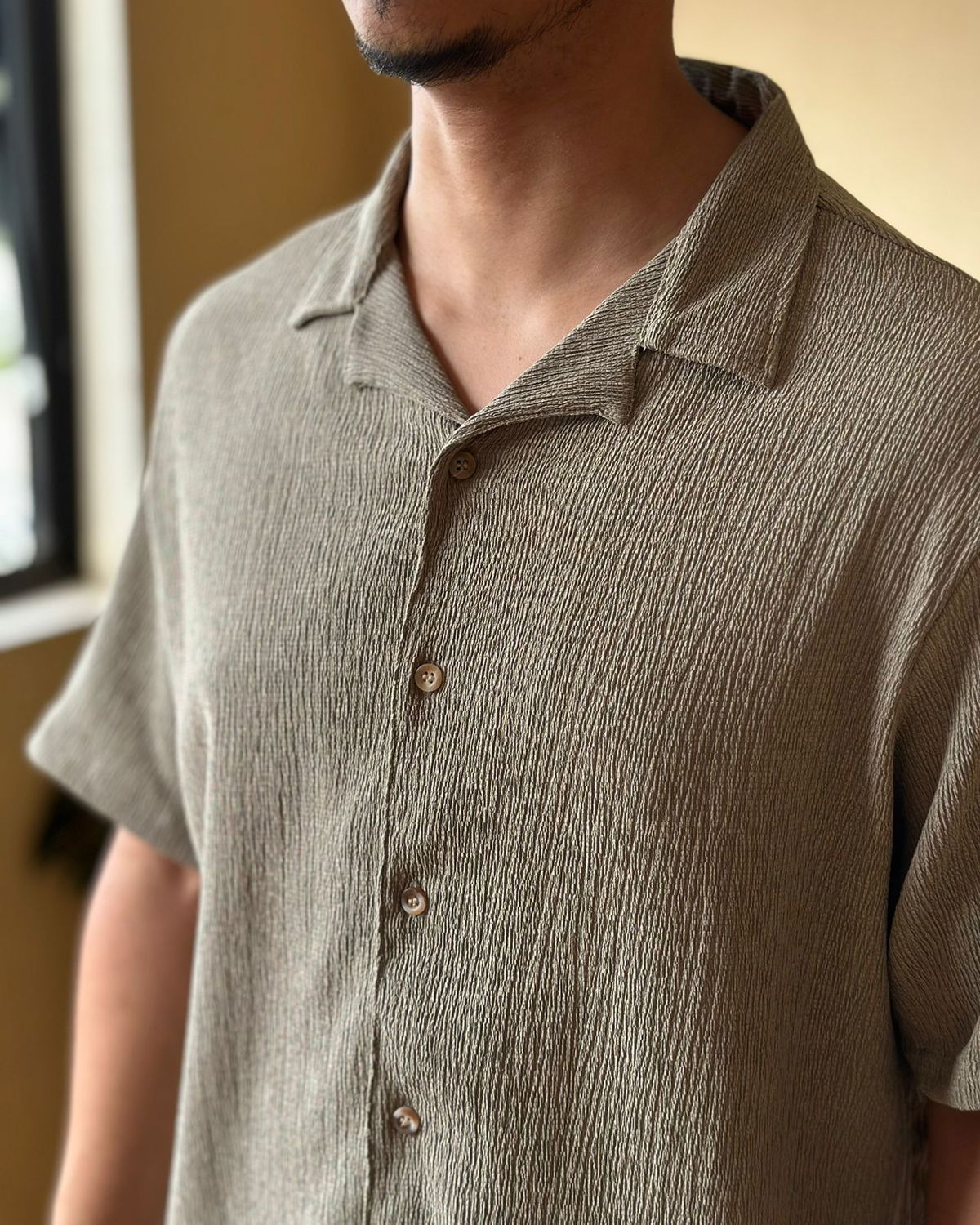 Camisa de lino texturado cuello clásico, corte oversize.