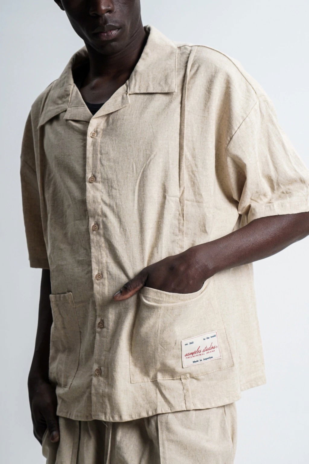 Camisa manga corta de lino, recortes y bolsillos delanteros con parches bordados. Corte boxy.