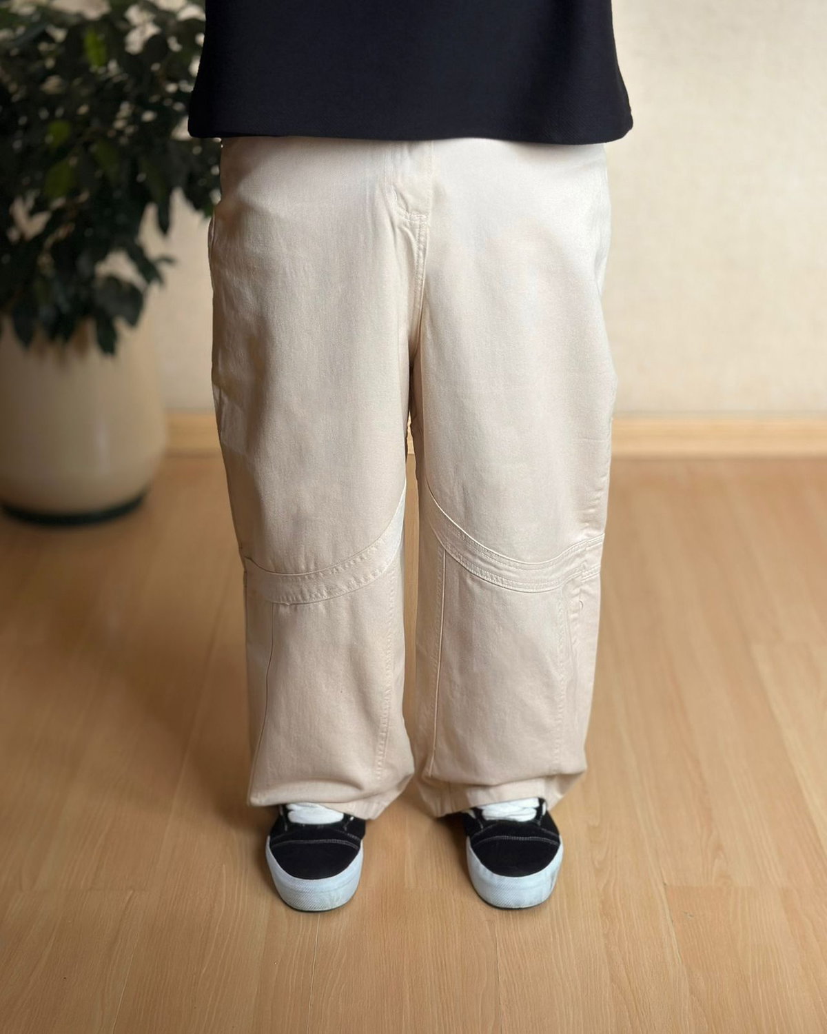 Jean de gabardina con detalles de recortes en rodillas. Corte baggy.