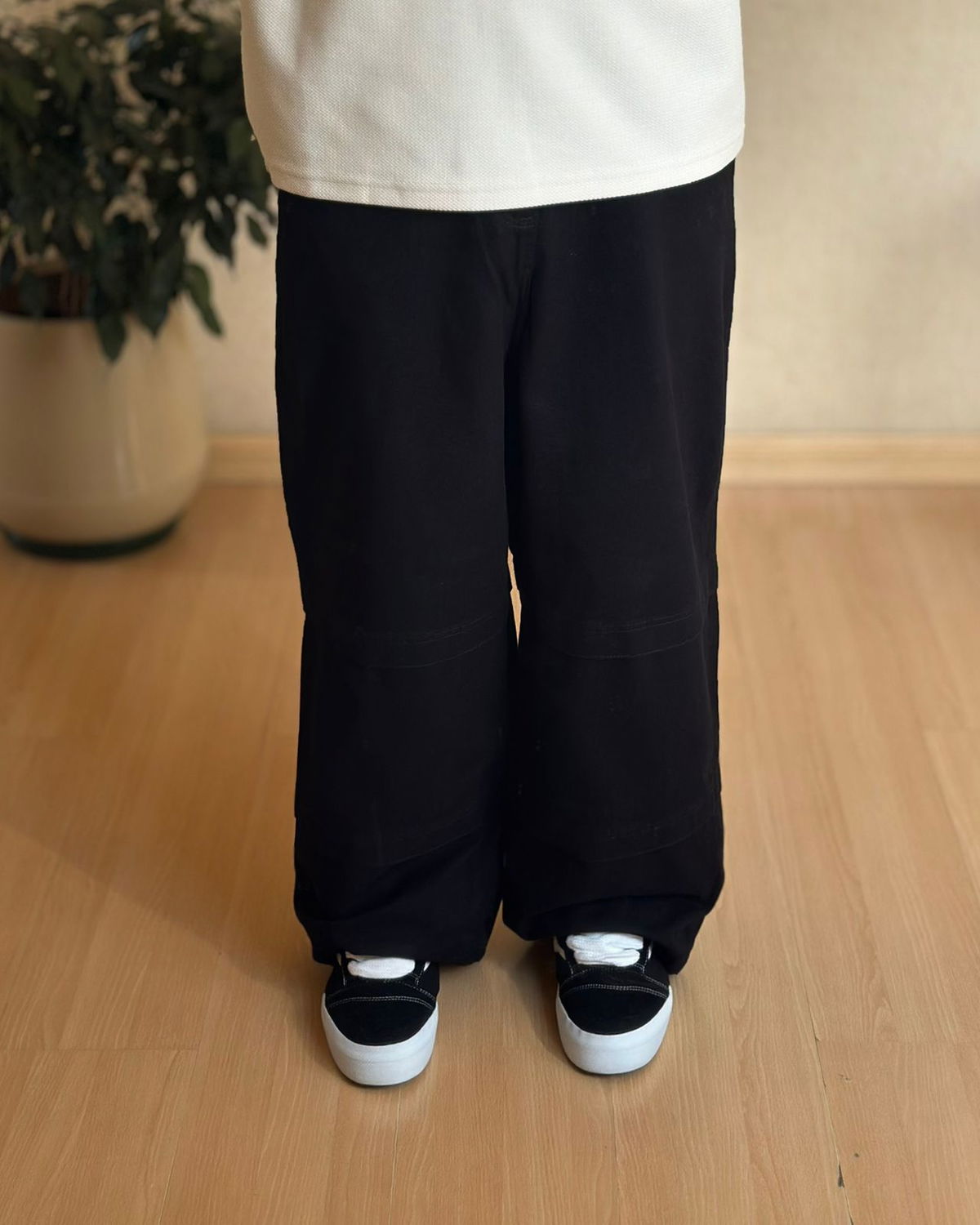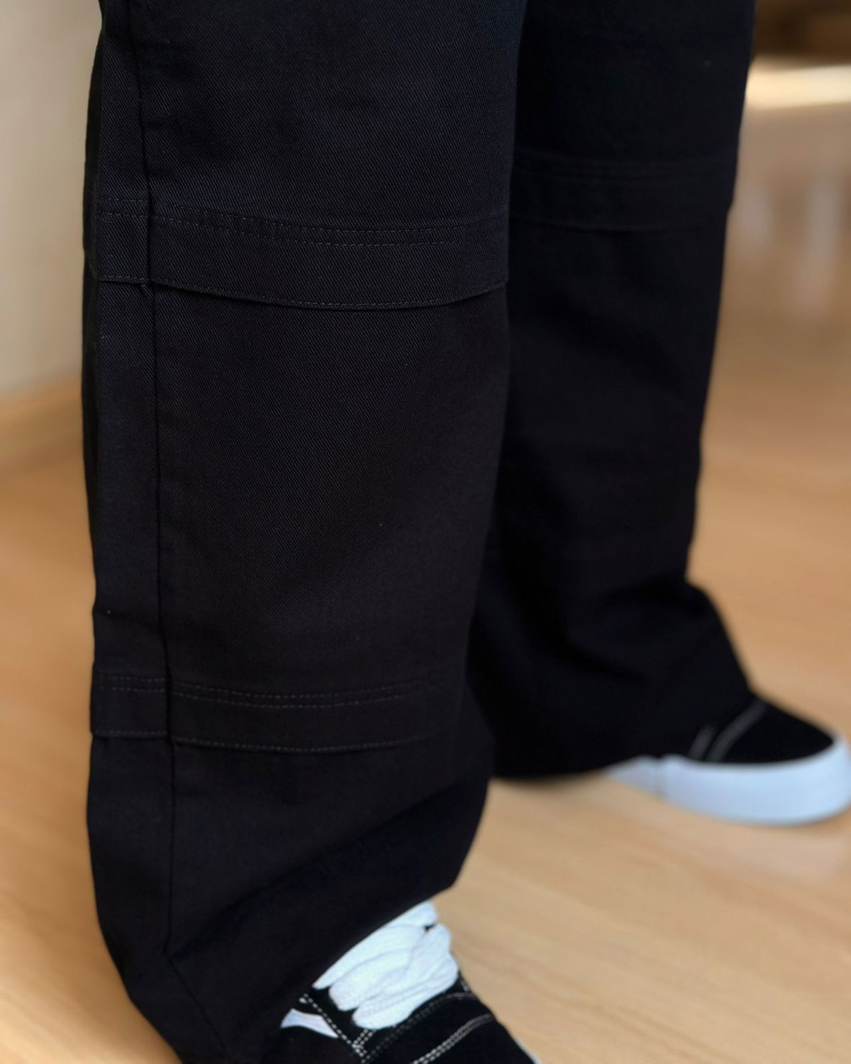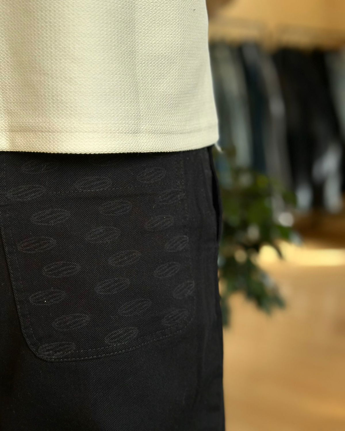 Jean de gabardina con detalles de recortes en rodillas y bolsillos estampados a láser.