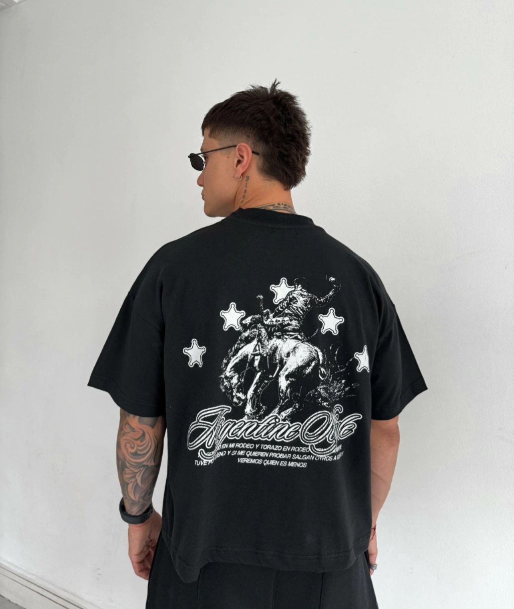 Remera de algodón peinado con cuello en ribb y costuras dobles reforzadas. Estampado en frente y espalda en serigrafia de alta densidad. Corte boxy.