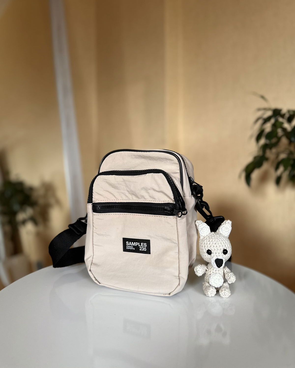 Morral de 3 bolsillos con cinta regulable.