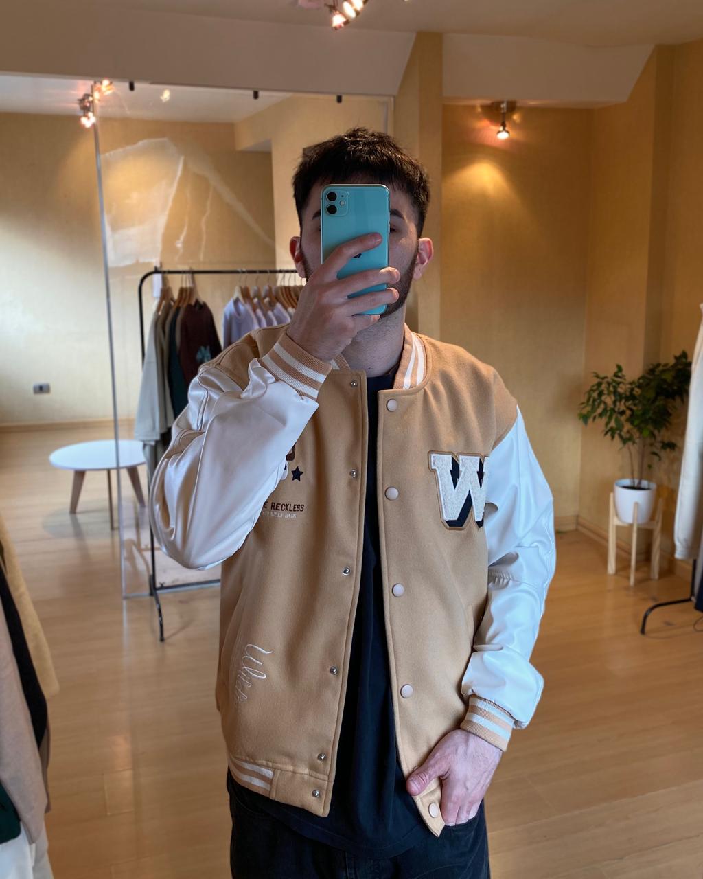 Campera bomber universitaria de paño con mangas de cuerina y detalles bordados.