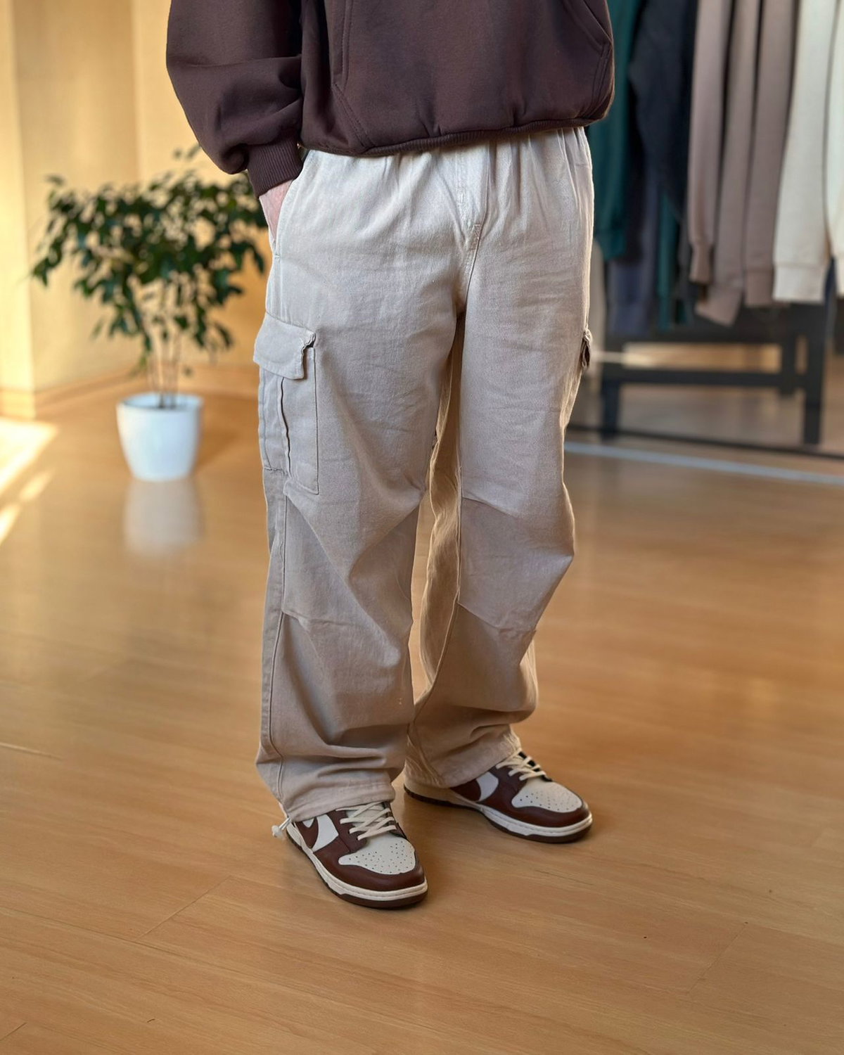 Parachute baggy cargo beige de 4 bolsillos. Cintura elastizada y botamanga regulable.