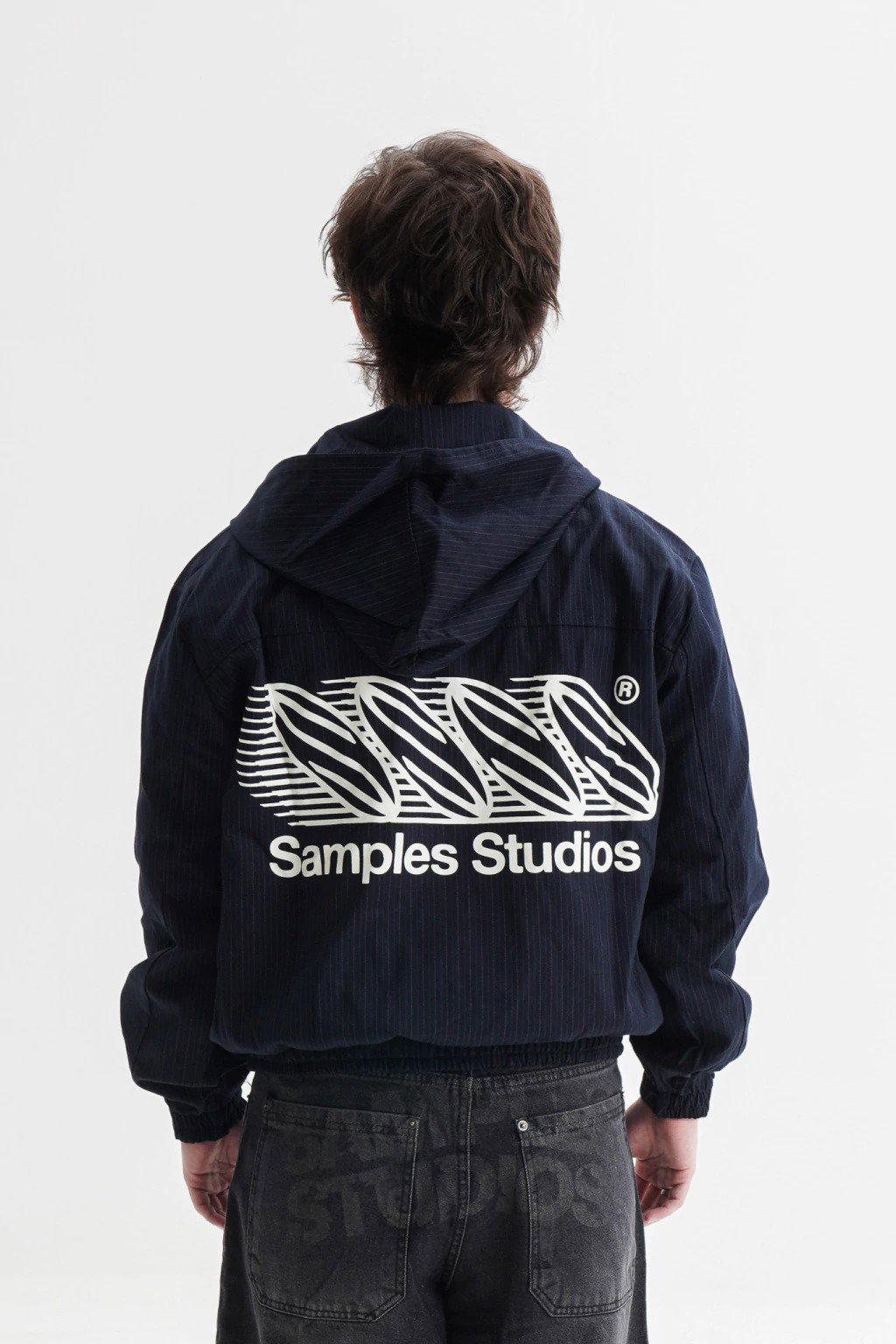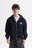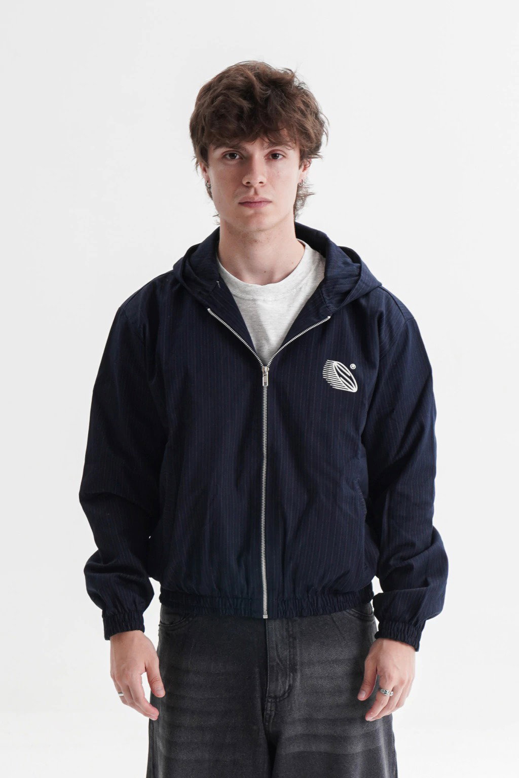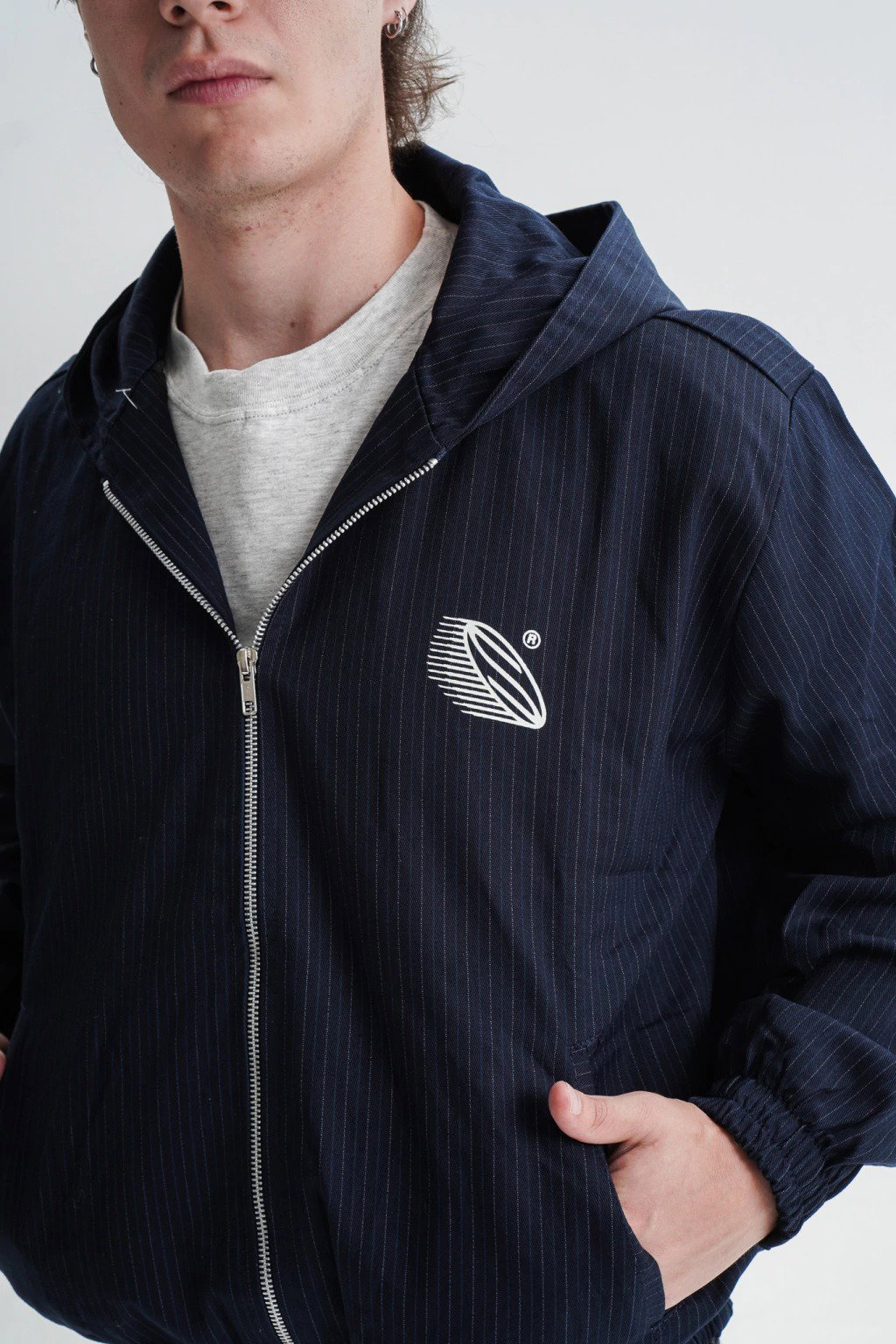 Campera zip de gabardina azul de rayas, forrada por dentro con capucha.