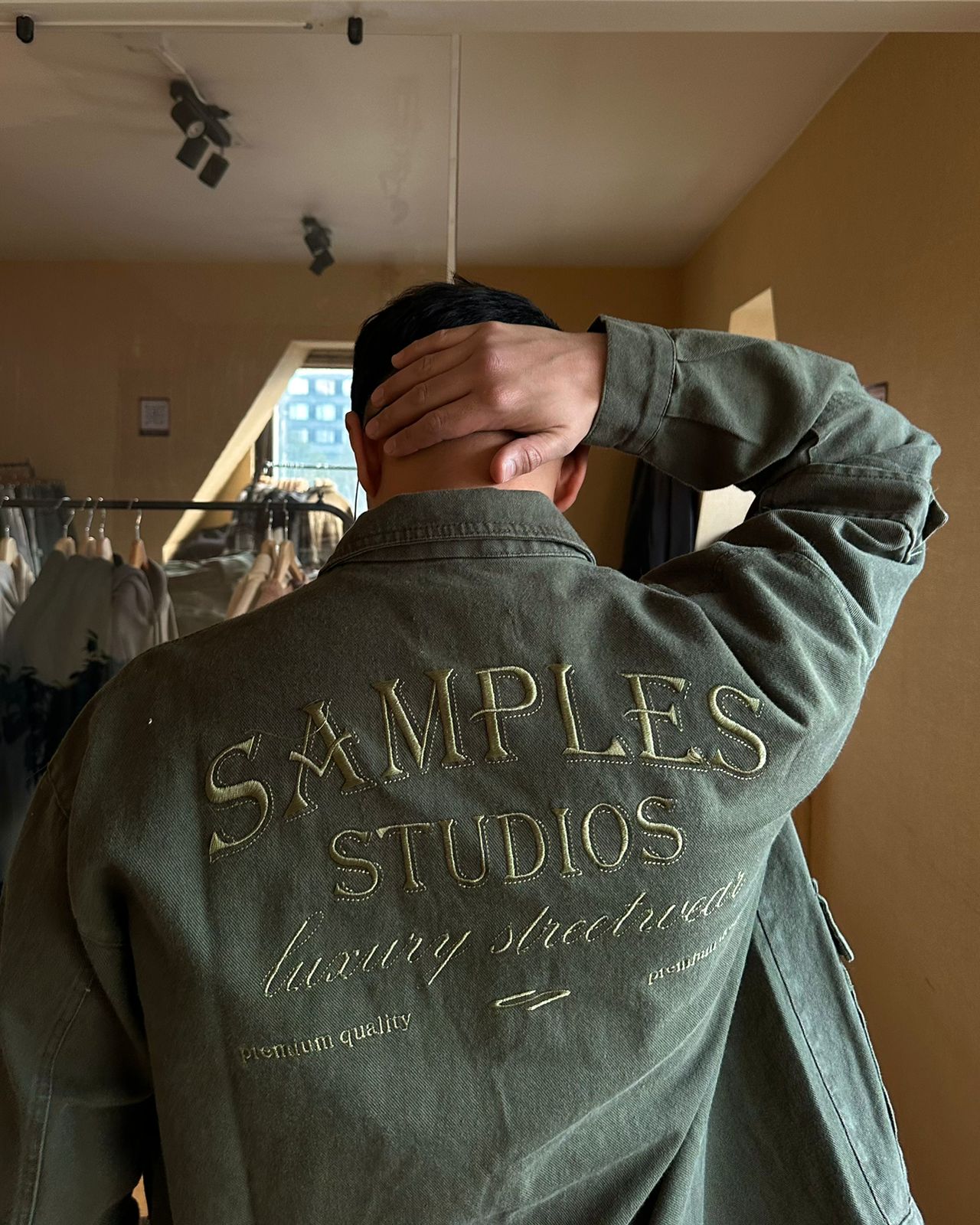 Campera de jean rígida con bolsillos laterales, corte oversize. Bordado en frente y espalda.