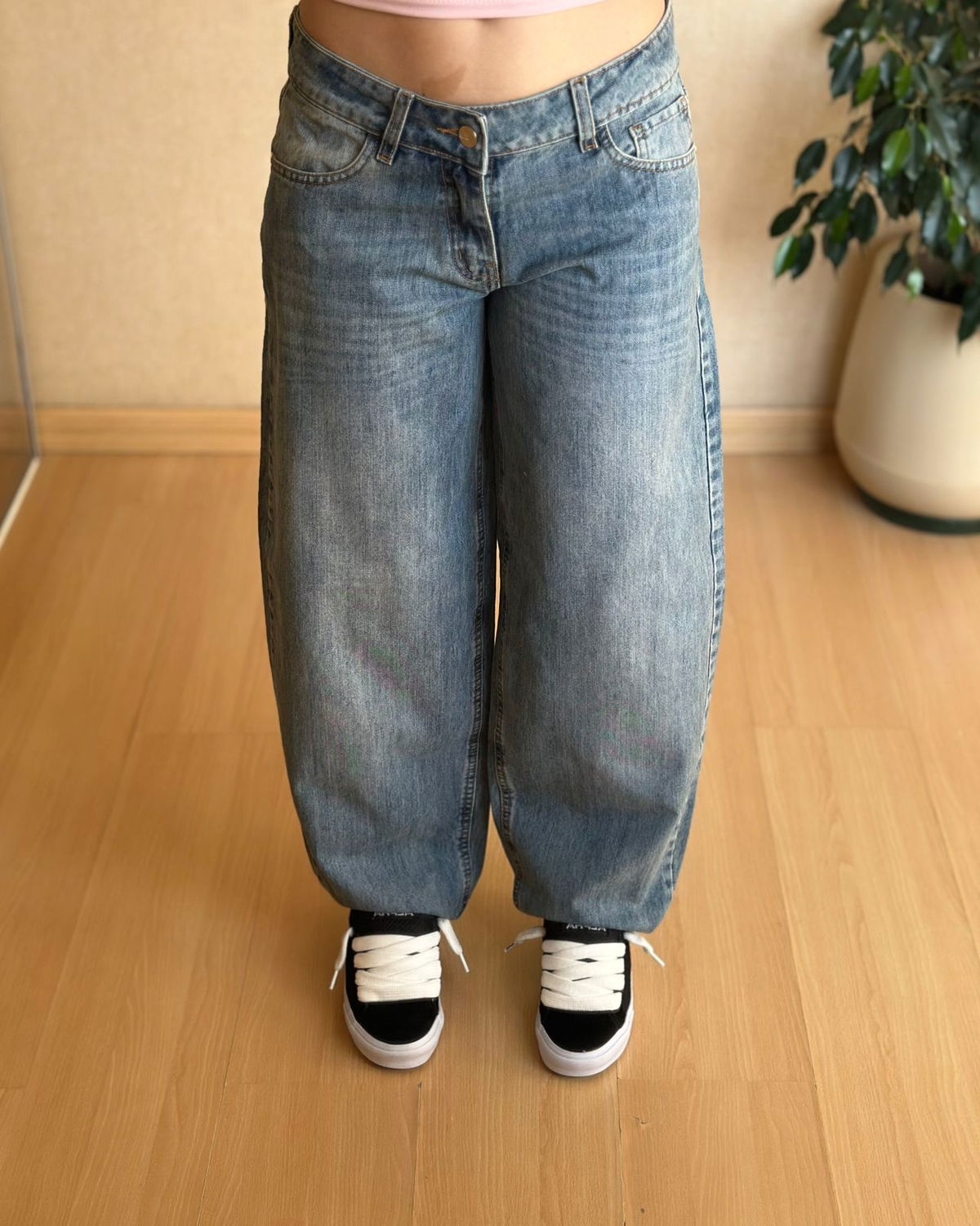 Jean rígido tiro bajo. Liso corte baggy.