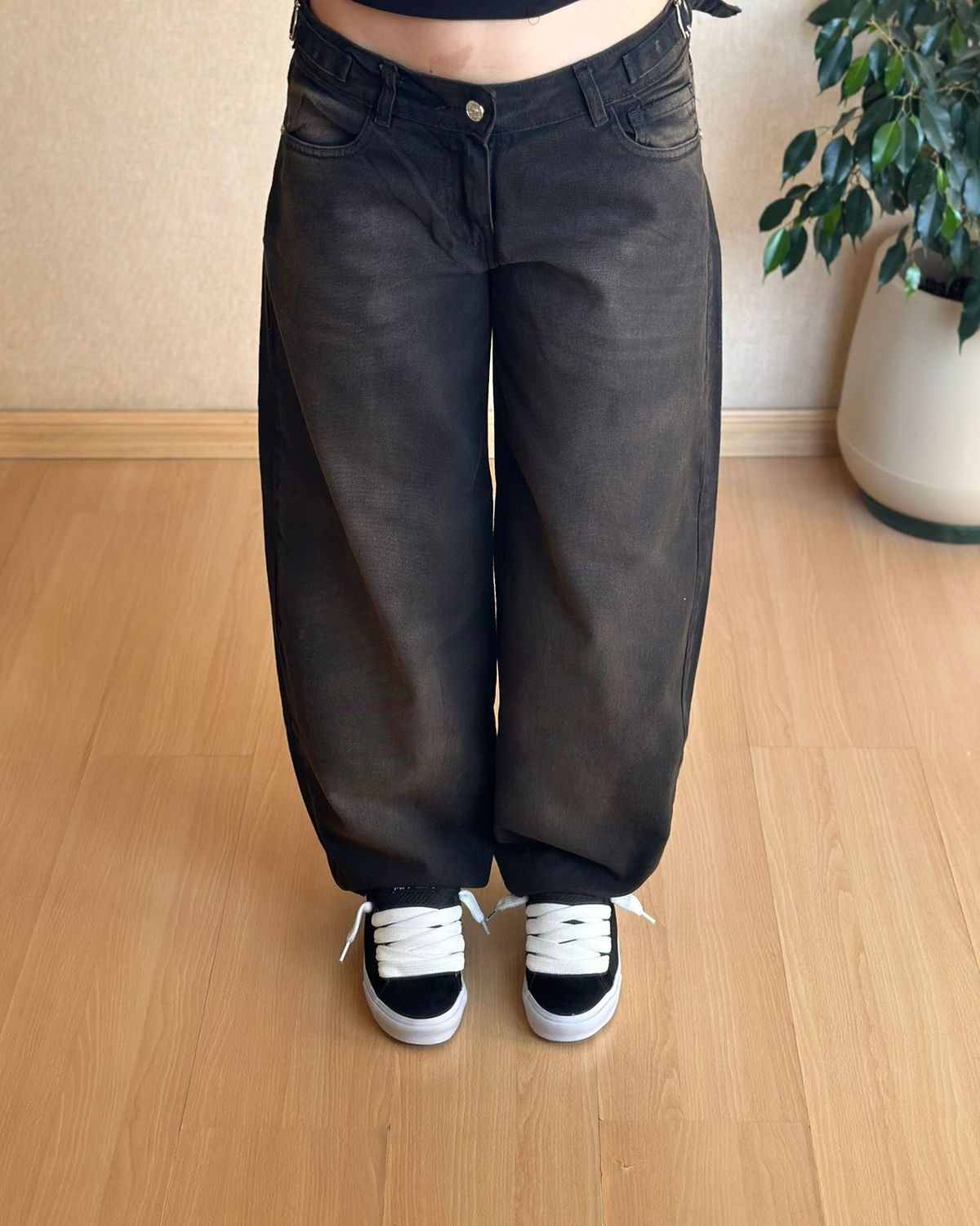 Jean rígido tiro bajo con hebilla lateral regulable. Liso corte baggy.