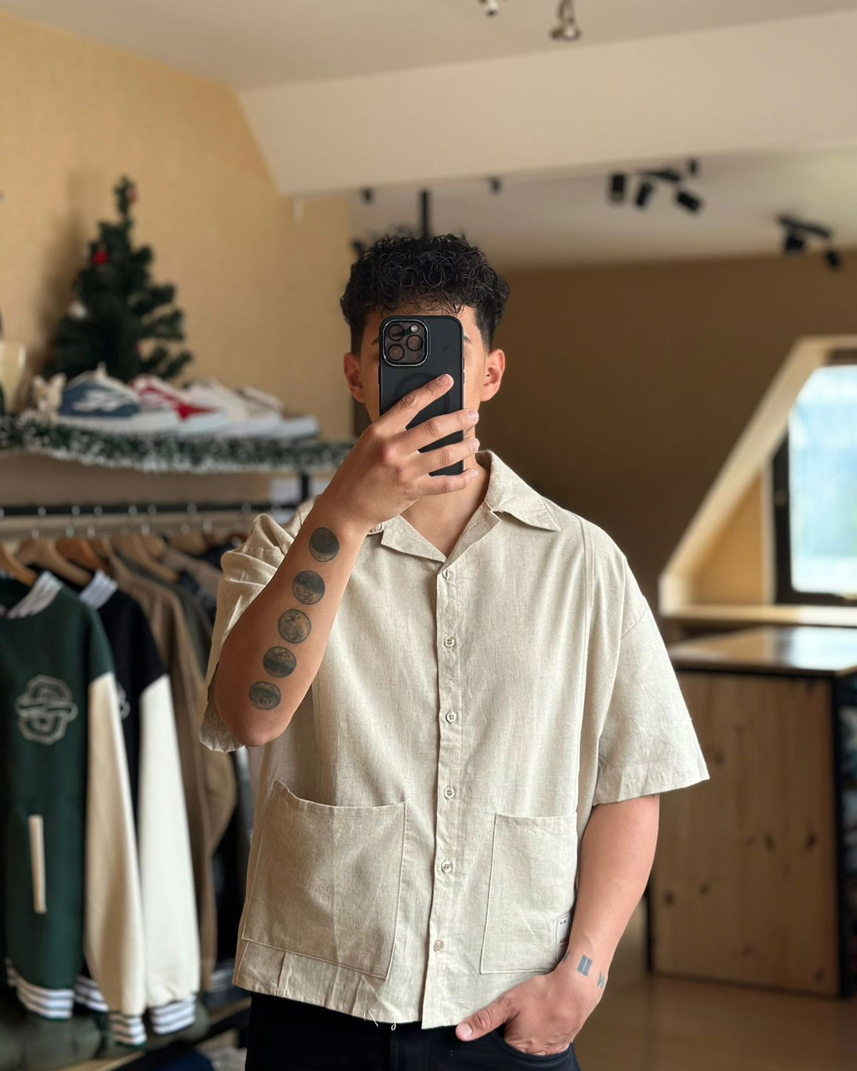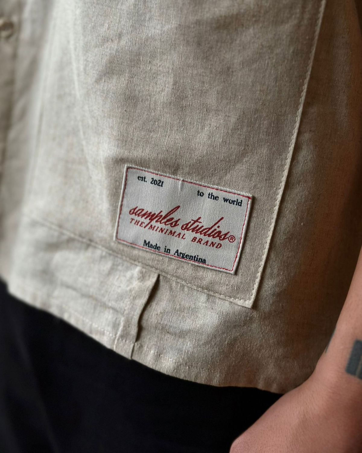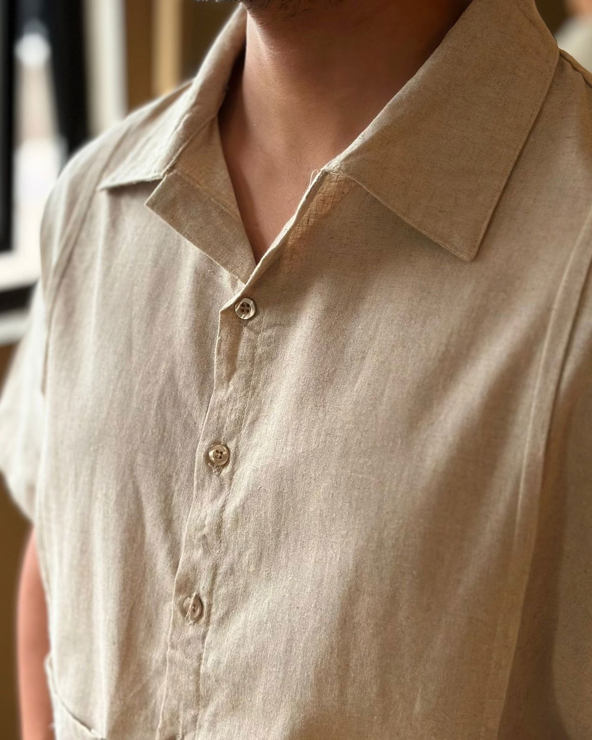 Camisa manga corta de lino, recortes y bolsillos delanteros con parches bordados. Corte boxy.