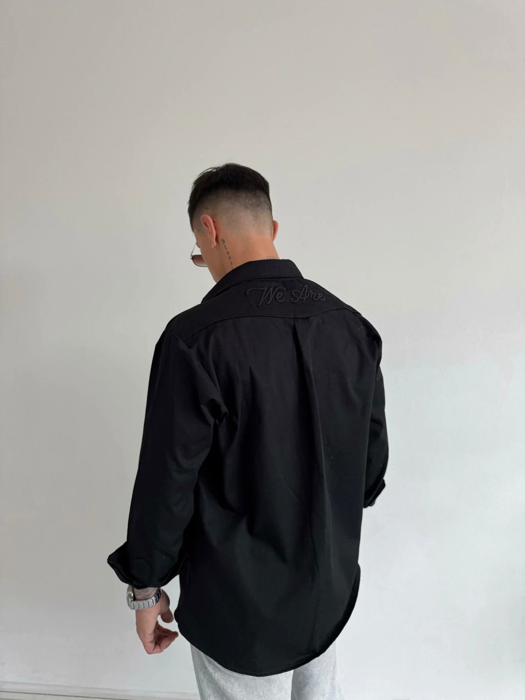 Camisaco de gabardina con bordado a tono en espalda. Corte oversize.