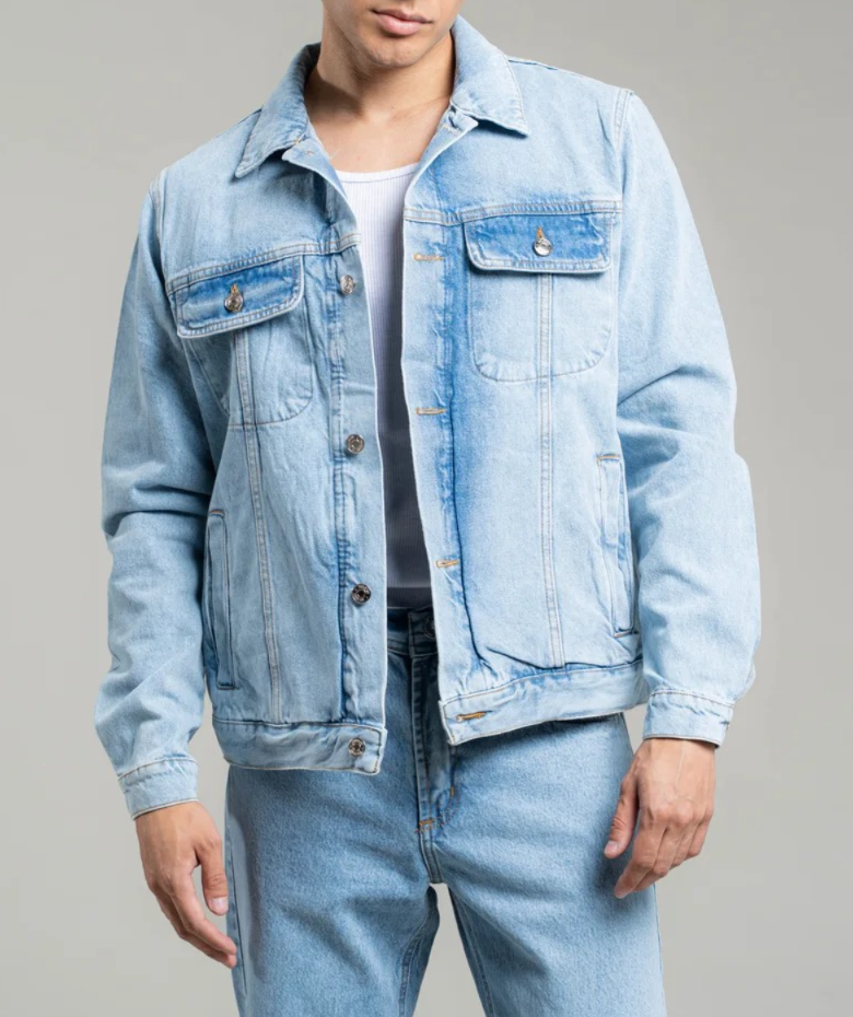 Campera de jean rígida con bolsillos laterales, corte oversize. Bordado en espalda.