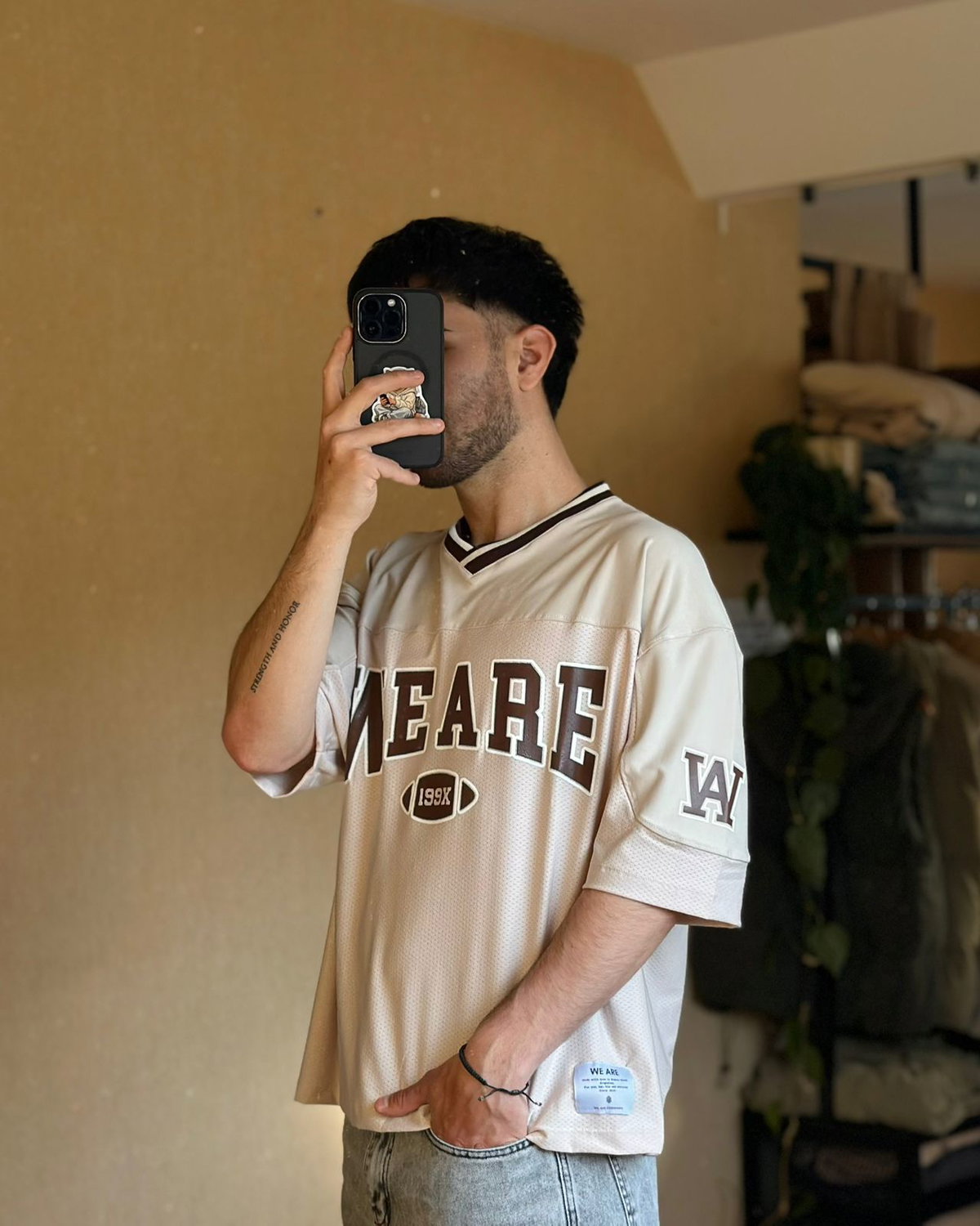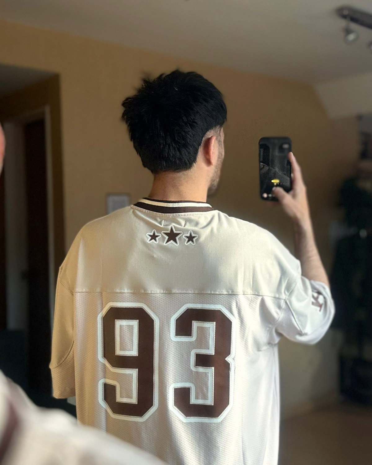 Remera dry fit y poliéster estilo fútbol americano con cuello tejido a tono. Estampado en frente y espalda en serigrafia de alta densidad. Corte boxy.