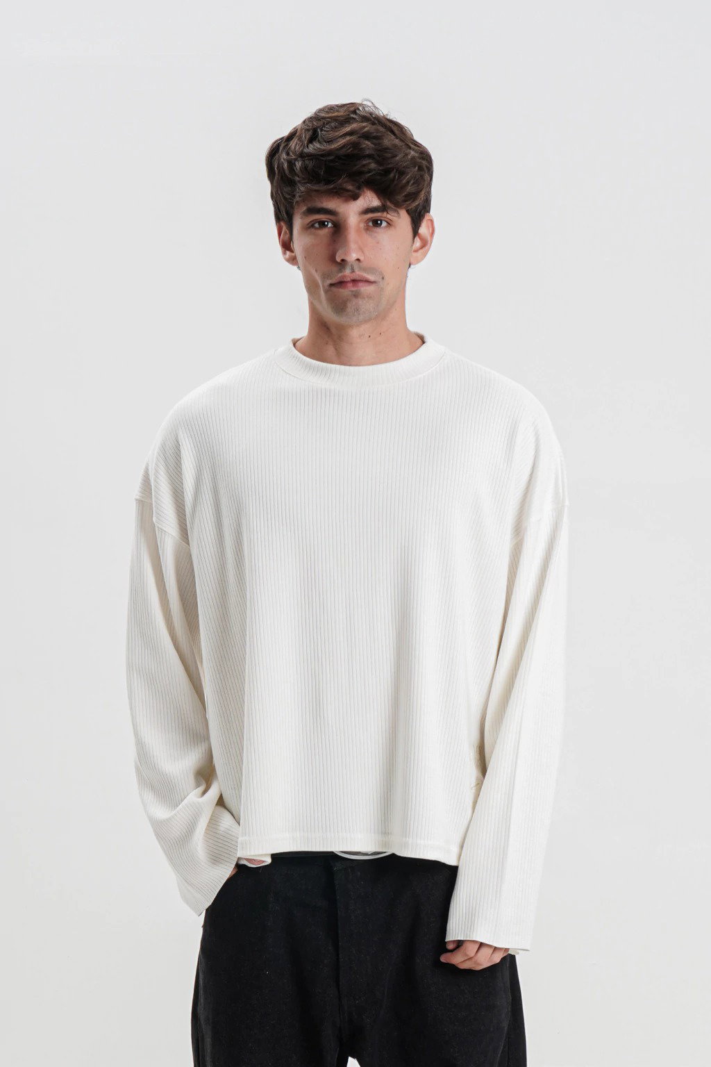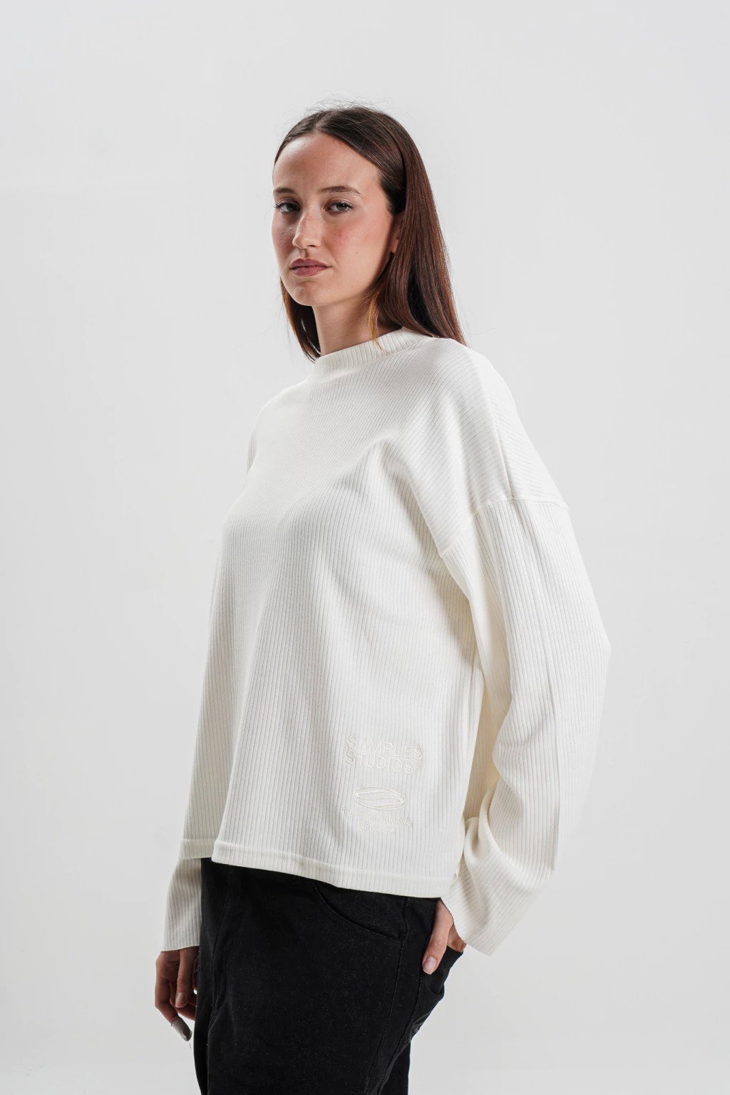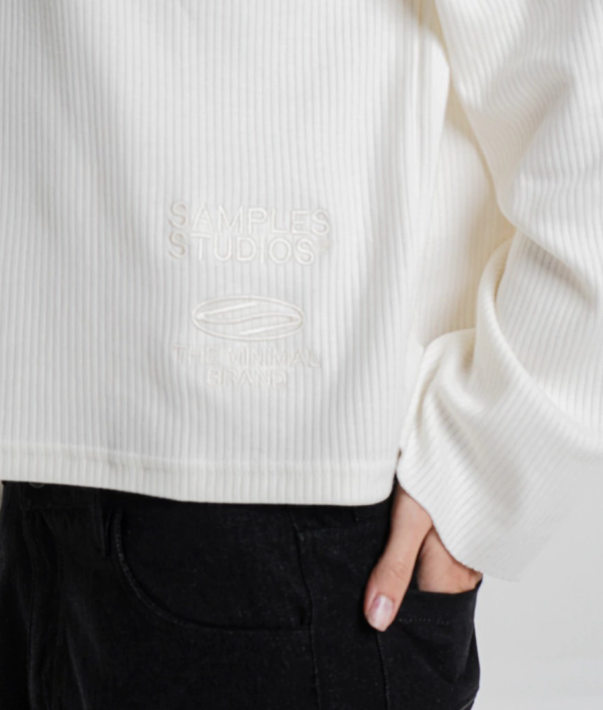 Remera unisex confeccionada en tela canale fino manga larga. Detalle bordado en la parte inferior derecha, corte boxy.